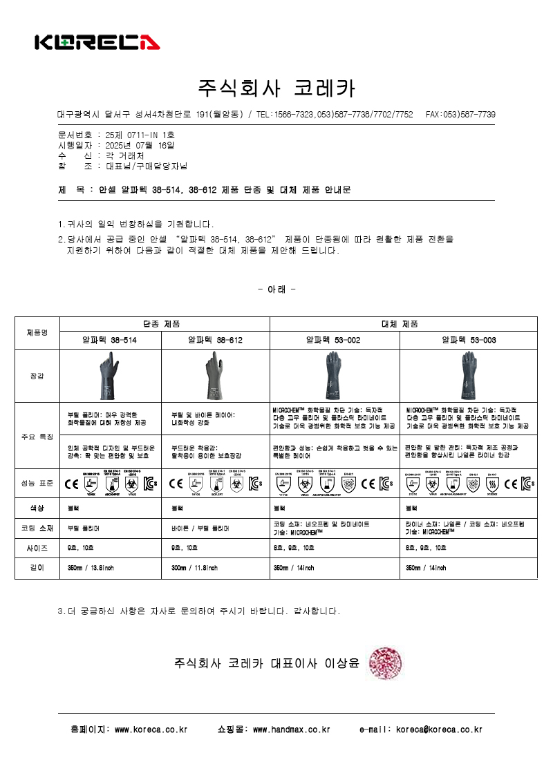 안셀 AlphaTec 38-514,38-612 단종에 따른 대체품 안내문 |
